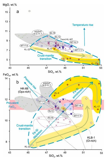 Comparisons of basic pseudotachylytes from the MSF and volcanic rocks from the KSZHT on MgO–SiO2 (a) and FeOtot–SiO2 (b) diagrams. In diagrams, measured major oxide values are plotted. Among the KSZHT rocks, specifically distinguished are those of initial and final eruptions of the Kultuk Volcano in the MSF about 18 and 13 Ma (designated as KL18 and KL13, respectively), three phases of the Meteo Volcano (18.1, 17.7, and 17.6 Ma, designated as MT18.1, MT17.7, and MT17.6, respectively) that is the farthest from the MSF, and time-intermediate eruptions of the Karerny, Sukhoi, and Shirokiy volcanoes (designated as KSZHT 16.0–11.7) that arrange along a west-east line occurred between the Kultuk and Meteo volcanoes (Figure 1). Symbols of the MSF low- and moderate-Ti basic pseudotachylytes are as in Figure 4. Shown for comparisons are also data fields of melts experimentally generated from the lherzolites enriched in olivine (KLB-1) and orthopyroxene (HK-66) with pressure rise [].