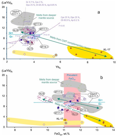 From results of modeling, melts of garnet-bearing and garnet-free deep-seated sources were discriminated by a (La/Yb)N ratio of 9.5 (normalization to the pyrolite []). The values >9.5 and <9.5 were defined as indicators of garnet-bearing (mantle) and garnet-free (crustal) sources, respectively. The (La/Yb)N ratio is used further for a gradation of the KSZHT melts from relatively low degrees of melting in a deeper lithospheric mantle source (F ~ 0.05, (La/Yb)N = 13–18), through elevated degrees of melting in a sub-crustal level (F ~ 0.08, (La/Yb)N = 10–12) to higher degrees of melting at the base of the crust (F = 0.15–0.23, (La/Yb)N = 10–12) (Figure 10a).