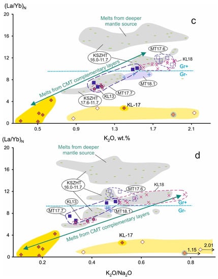 On (La/Yb)N-K2O and (La/Yb)N-K2O/Na2O diagrams (Figure 10c,d), volcanic rocks of the eruptive phases MT18.1, MT17.7, KL18, and KL13 from the Meteo and Kultuk volcanoes form trends almost coincided with those of rocks from other KSZHT volcanoes. These diagrams demonstrate an increasing role of a K2O in melts from garnet-bearing deep-seated sources with its complementary decreasing in those from garnet-free ones.