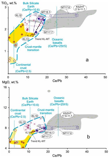 On TiO2-Ce/Pb and MgO-Ce/Pb diagrams (Figure 11a,b), sample KL-9 fits to lava trends of the first two phases in the Meteo Volcano (MT18.1 and MT17.7). Rocks of the initial eruption phase in the Kultuk Volcano (KL18) also partially fall into this trend. On the MgO-Ce/Pb diagram, rocks from this volcano are mostly shifted to the left with decreasing Ce/Pb ratio. In lavas of other KSZHT volcanoes, a Ce/Pb ratio increases to the ocean basalt value and partially exceeds it.