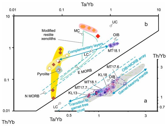On the Th/Yb versus Ta/Yb diagram, rocks of the continental crust are plotted above the mantle array displayed by OIB and MORB []. In a garnet-bearing source, both ratios increase; while in absence of garnet, both ratios decrease. Points of initial lavas from a garnet-free source of the Meteo Volcano (MT18.1) are shifted below the ocean basalt array with a relative increase in a Ta/Yb ratio (Figure 12a). Points of lavas of the next eruption phase from a garnet-free source of the same volcano (MT17.7) are slightly shifted relative the data field of initial lavas toward the lower crust composition. A more advanced shift is shown by final basalts from the garnet-free source of the Kultuk Volcano (KL13), while lavas of the initial eruptions of this volcano (KL18) belong to a trend of garnet-bearing deep-seated sources that extends along the OIB and MORB array. Melts from the KSZHT deep-seated sources are complementary enriched in tantalum (with increasing Ta/Yb and decreasing Th/Ta) relative to OIB melts due to melting both garnet-free lower crust and underlying garnet-bearing mantle. Melts of basic pseudotachylytes from the garnet-free crust, on the contrary, are complementary depleted in tantalum (with a relative decrease in Ta/Yb) (Figure 12b). The KSZHT magmas erupted from sources of modified restite material that had lost the basic pseudotachylyte component.