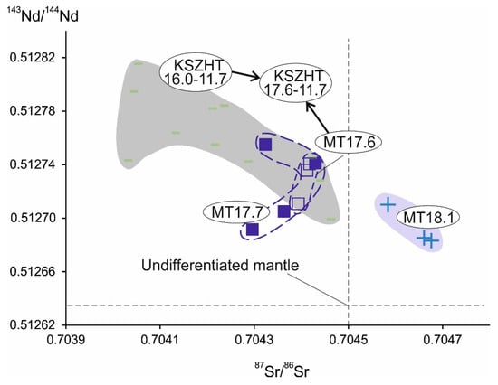 143Nd/144Nd–87Sr/86Sr diagram showing points of the initial eruption phase from a garnet-free source (MT18.1) in the Meteo Volcano, the intermediate phase from the garnet-free and garnet-bearing sources (MT17.7), and the final phase of this volcano (MT17.6). The latter is comprised with a set of younger volcanic rocks from garnet-free and garnet-bearing sources (KSZHT16.0–11.7) into a common array (KSZHT 17.6–11.7). Symbols are as in Figure 9.