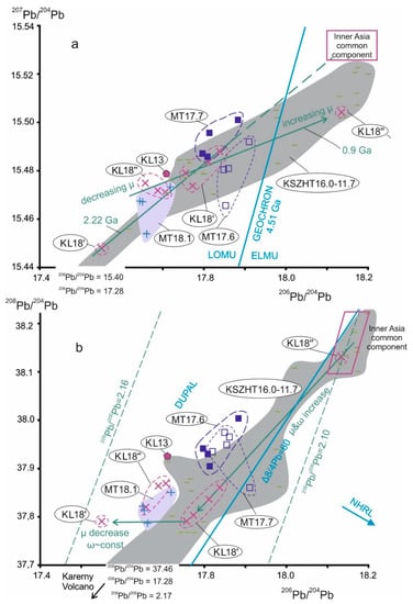Diagrams of 207Pb/204Pb-206Pb/204Pb (a) and 208Pb/204Pb-206Pb/204Pb (b) for volcanic rocks from the KSZHT. Measurement errors of isotope ratios do not exceed icon sizes. On diagram a, shown are the Inner Asia common component and the geochron of Low μ Viscous Protomantle (LOMUVIPMA) with a slope corresponding to an age of 4.51 Ga, obtained for a source of volcanic rocks from the northwestern Udokan volcanic field in the reactivated part of the Siberian paleocontinent []. On diagram b, designated are the boundary of the DUPAL anomaly at Δ8/4Pb = 60 [] and estimated maximal 232Th/238U ratio (explanation in the text). Symbols are as in Figure 9.