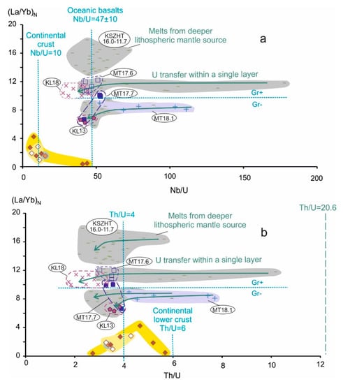 The CMT deep-seated sources of the KSZHT volcanic rocks show significant deviations of Nb/U and Th/U ratios from the OIB values. On diagrams of Figure 15a,b, rare points are notably shifted to the right. Due to increased partial melting, the (La/Yb)N values in the left clusters of points are slightly decreased. Predominating data points with low Nb/U and Th/U ratios may indicate intensive magma generation processes in U-rich sources that are characteristic of both garnet-bearing and garnet-free layers of the CMT region.