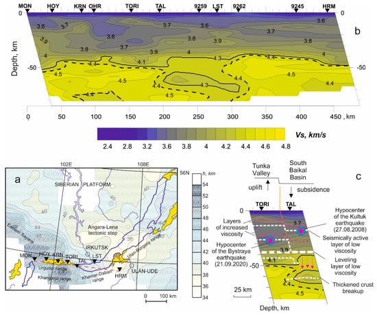 - Mordvinova, V.V.; Kobelev, M.M.; Khritova, M.A.; Turutanov, E.Kh.; Kobeleva, E.A.; Trynkova, D.S.; Tsydypova, L.R. The deep velocity structure of the southern margin of the Siberian Craton with respect to Baikal rifting. Dokl. Earth Sci. 2019, 484, 66–70. [Google Scholar] [CrossRef]