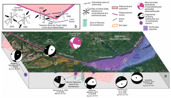 - Sankov, V.A.; Lukhnev, A.V.; Miroshnichenko, A.I.; Dobrynin, A.A.; Ashurkov, S.V.; Byzov, L.M.; Dembelov, M.G.; Calais, E.; Deversher, J. Contemporary Horizontal Movements and Seismicity of the South Baikal Basin (Baikal Rift System). Izv. Phys. Solid Earth. 2014, 50, 785–794. [Google Scholar] [CrossRef]