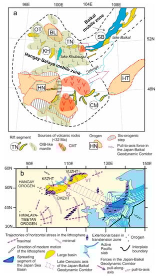 - Sankov, V.A.; Parfeevets, A.V.; Lukhnev, A.V.; Miroshnichenko, A.I.; Ashurkov, S.V. Late Cenozoic geodynamics and mechanical coupling of crustal and upper mantle deformations in the Mongolia–Siberia mobile area. Geotectonics 2011, 45, 378–393. [Google Scholar] [CrossRef]