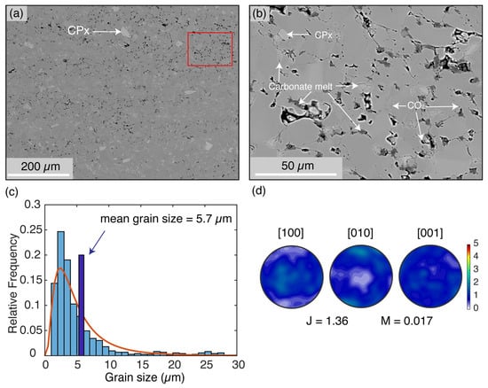 The backscattered electron (BSE), grain size, and crystallographic orientations of the hot-pressed sample (W2261). (a) and (b) are BSE images. The red frame in (a) indicates where the region of (b) was picked. The majority of the grey phase is olivine, with small contrast caused by orientation. The oblate and rotund voids are CO2 (formerly CO2-filled). The voids at triple junctions are interpreted to be CO2 and surrounding the carbonate melt, removed during polishing. A few CPx grains (light grey) are observed. The compositions of light-grey and dark-grey carbonate melt are provided in the Appendix A, Table A1. (c) Frequency distribution of grain size. The red curve is a lognormal distribution of grain size. The mean is noted on the histogram. (d) Pole figures of crystallographic orientations. Color scale indicates the multiples of a uniform distribution (MUD).