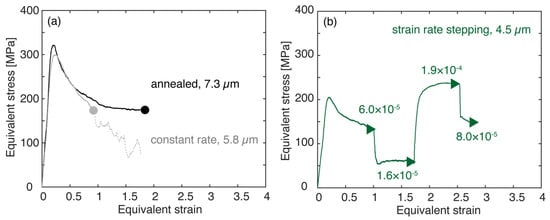 Grains were constructed from processed orientation data using the MTEX toolbox [32] in MATLAB. Grain boundaries were drawn where neighboring pixel misorientations exceeded 10°. No extrapolation of orientation data was applied in MTEX, because the data were already processed by the HKL Channel5 software. Grain size was determined by applying a factor of 4/π [33] to the equivalent diameter of a circle with the area of each grain in cross section. In the analysis of the average grain size for a map, grains containing less than four pixels or lying on the edge of the map were excluded.