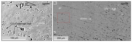Here, detailed microstructural observations of a deformed sample (W2264) are presented. As illustrated in Figure 4, CO2 and carbonate melt were highlighted as pores in the micrographs of the etched polished section. The size and distribution of the pores illustrates the redistribution of CO2 induced by shear deformation. The size of the pores, that is, the size of CO2 and melt pockets, ranged from a couple of microns to close to the lower limit of the olivine grain size. The smaller pores, probably single CO2 pockets, were sparsely and homogenously distributed at olivine three- and four-grain junctions and along the olivine grain boundaries as isolated “bubbles”. The presence of CO2 pocket at triple junctions can arise because of a relatively high fraction of CO2 (>5%), which is consistent with the calculations of von Bargen and Waff [42].