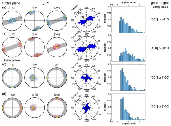 In the profile plane, [010] axes form strong point maxima sub-perpendicular to the shear plane, so comparisons were only obtained between the relative lengths of grains along the [001] and [010] axes (Figure 7a), and between the relative lengths of grains along the [100] and [010] axes (Figure 7b). In Figure 7a, [001] axes align subparallel to the shear direction in this subset, and the SPO reveals that the orientation of the long axes is in the same direction as the [001] axes. Therefore, grains are longer along [001] axes than along [010] axes. Similarly, Figure 7b indicates that grains are longer along [100] axes than along [010] axes. In the shear plane (Figure 7c,d) the relative lengths along the [100] and [001] axes are compared. In both panels, grain shape exhibits a bimodal distribution. The primary mode corresponds to long [001] axes, while the secondary mode corresponds to elongated [100] axes. This result suggests that grains have similar lengths along [100] and [001] axes, with more grains slightly longer parallel to [001] axes.