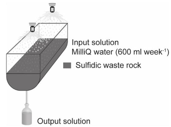Kinetic testing was conducted in non-saturated small-scale test cells to study pyrite-rich waste rock oxidation. The experimental setup deviated from standard column testing and was chosen explicitly to study secondary mineral formation for sulfide oxidation preventive purposes [5,8]. It has been shown that precipitation of, e.g., hydrous ferric oxides (HFO) is predominant at the interface between mine waste and alkaline source [9,10]; therefore, it was desirable to have a large cell surface area. The experimental design consisted of high-density polyethylene cells with surface areas of 513 cm2 and a total volume of 10 L (Figure 1). The cells were irrigated weekly with 600 mL of MilliQ water (0.05 µS/cm), corresponding to average annual precipitation in the area and equivalent to a yearly L/S weight ratio of approximately 4. The bottom of each cell was lined with geotextile to avoid clogging of the tap. A total of four cells were constructed and filled with 7.55 kg of crushed waste rock (5–30 mm sieve size). Results from the reference cell’s long-term leaching (solely waste rock) are presented here to illustrate the extent of trace elements’ mobility related to their presence and exposure in pyrite. Three of the cells were used to prevent sulfide oxidation and have been published previously [5,8].