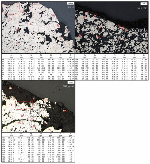 The whole-rock chemical composition showed an elevated abundance of As (217 ppm), Hg (17 ppm), Sb (38 ppm), and Tl (26 ppm) with smaller Cu (19 ppm), Pb (22 ppm), and Zn (68 ppm) content (Table 3). However, neither of the minerals identified occurred in sufficiently high quantities to explain the element concentrations observed. Pyrite was the most abundant mineral in the waste rock; therefore, knowledge about trace element composition and deportment within the pyrite grains are important. Impurities and mineral inclusions can lead to physical stress in the crystal structure, making the mineral more susceptible to oxidation [30], profoundly affecting the leachate quality. Charting count data of spot analyses tracks how trace element content changes during an analysis as deeper portions of the grains are sampled by the laser (Figure 6). Observations using charting count data show that the pyrite has several types of zonations containing trace elements. Changes in pyrite composition from As-rich to Hg- and Tl-rich and an overall weak negative covariance could be seen for As and Tl. A quantitative analysis of pyrite using LA-ICP-MS (Figure 2) showed that although As was present in all spot analyses, there were large variations in concentrations, with the highest observed in crystalline pyrite. As seen in Figure 2, concentrations of As in the initial pyrite varied between 67 and 585 ppm, resulting in an average concentration of 272 ppm. Additionally, pyrite oxidized for 52 weeks showed higher concentrations of As than the initial pyrite (Figure 2). Variations in concentrations during the first year are likely the result of internal variations combined with the previously proposed limited oxidation. Similar observations can be made for other trace elements such as Cu, Pb, and Tl (Figure 2). Mapping of the pyrite showed that As was the most evenly distributed element of those analyzed (Figure 7A), suggesting the occurrence of arsenic-bearing pyrite, which can increase the pyrite’s oxidation rate extensively [31]. Leaching mobilized As, resulting in concentrations between 0.2 µg/L and 21 mg/L [5].