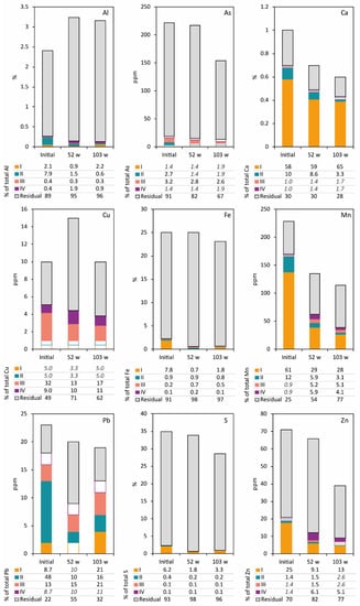 Figure 3. Extracted element content in the waste rock before leaching (initial) and on separate occasions at year one and two (weeks 52 and 103), modified from Nyström et al. [5]. Steps I–IV in sequential extractions after Dold (2003). Water-soluble fraction (I), exchangeable fraction (II), Fe(III)oxyhydroxides (III), and Fe(III)oxides (IV). Content below the detection limit is only outlined. The residual fraction (e.g., primary silicates and sulfides) is calculated as the difference between the whole rock element content of the sample (NaOH fusion) and the sum of steps I–IV.