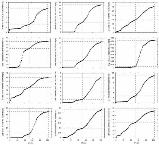 Figure 4. Estimated accumulated content of selected elements released into the leachate during 103 weeks of leaching the waste rock. The element content was calculated based on element concentrations reported by Nyström et al. [5] multiplied with the leachate volume withdrawn. Filled markings are actual measurements in the leachate. In contrast, outlined markings are estimated as the average between the two most adjacent actual measurements. Weeks 52 and 103 are marked with dashed vertical lines.