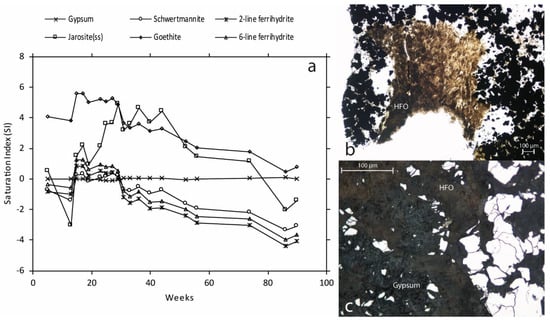 Figure 5. (a) Geochemical calculations of saturation index of Gypsum, Jarosite, Goethite (wateq4f.dat thermodynamic database [17]), Schwertmannite [20] originating from [21], and 6-line ferrihydrite [19] in the leaching of pyrite-rich waste rock. Dashed lines mark values close to zero (±0.5) which indicate equilibrium between the solution and mineral phase. Petrographical microscopic images after leaching the waste rock for 52 weeks. (b) Inferred HFO overgrowing muscovite (sericite). (c) Inferred Gypsum and HFO formation in bulk (between mineral grains).