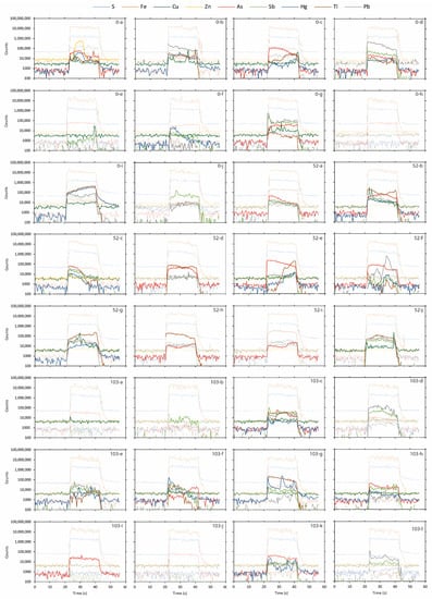 Figure 6. LA-ICP-MS element distribution with time showing how the association of As, Cu Hg, Sb, Pb, Tl, and Zn change with depth in spots measured in the initial sulfidic waste rock (Figure 2).