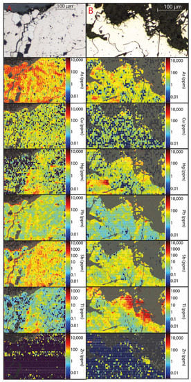 Figure 7. Quantified LA-ICP-MS element distribution maps of an area of pyrite grains in the initial sulfidic waste rock (A) and after 103 weeks of leaching (B) showing the spatial distribution of As, Cu, Hg, Pb, Sb, Tl, and Zn. Non-pyrite minerals are shaded.