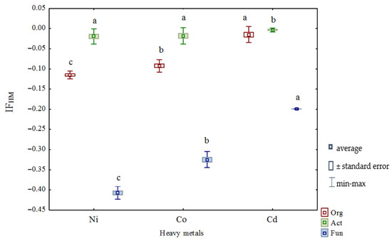 The influence of heavy metals (IFHM) on microbial counts in soil. Org—organotrophic bacteria; Act—actinobacteria; Fun—fungi. Cd—soil contaminated with cadmium; Co—soil contaminated with cobalt; Ni—soil contaminated with nickel. Identical letters (a–c) in columns denote the same homogeneous groups.