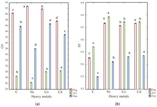Microbial colony development (CD) index (a) and ecophysiological diversity (EP) index (b) in soil. C—control soil; Cd—soil contaminated with cadmium; Co—soil contaminated with cobalt; Ni—soil contaminated with nickel. Identical letters (a–d) in columns denote the same homogeneous groups.
