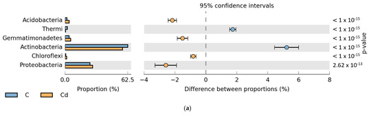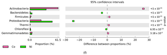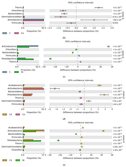 The relative abundance of the dominant bacterial phyla in soil, where the difference in the proportions of the dominant phyla ≥ 1%. C—control soil; Cd—soil contaminated with cadmium; Co—soil contaminated with cobalt; Ni—soil contaminated with nickel. (a): between C—Cd; (b): between C—Co; (c): between C—Ni; (d): between Cd—o; (e): between Cd—Ni; (f): between Co—Ni.