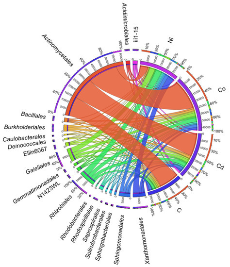 The relative abundance of the dominant bacterial orders in soil, where the difference in the proportions of the dominant families ≥1%. C—control soil; Cd—soil contaminated with cadmium; Co—soil contaminated with cobalt; Ni—soil contaminated with nickel.