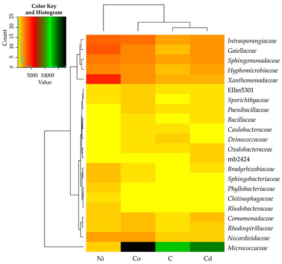 Bacteria of the family Micrococcaceae (phylum Actinobacteria) were predominant in control soil and in treatments contaminated with Cd2+ and Co2+ (Figure 5). Under exposure to Ni2+, the number of Micrococcaceae OTUs decreased nearly 20-fold, whereas a significant increase was observed in the abundance of bacterial families Gaiellaceae, Nocardioidacea and Intrasporangiaceae of the phylum Actinobacteria, family Xanthomonadaceae of the phylum Proteobacteria and families Sphingobacteriaceae and Hyphomicrobiaceae of the phylum Bacteroidetes. The structure of bacterial communities was also modified in treatments contaminated with Cd2+ and Co2+ relative to control, but these changes were not as spectacular as those observed in Ni2+ treatments. The number of OTUs associated with bacterial families Gaiellaceae and Hyphomicrobiaceae was significantly higher in soil contaminated with Cd2+ and Co2+ than in uncontaminated soil. In turn, bacteria of the family Nocardioidaceae were more abundant in soil contaminated with cobalt than in the control treatment and in soil exposed to cadmium.