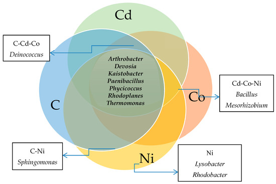 Venn diagram of unique and common bacterial genera where the number of specific bacterial OTUs >1%. C—control soil; Cd—soil contaminated with cadmium; Co—soil contaminated with cobalt; Ni—soil contaminated with nickel.