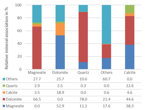 Figure 3 displays that the main gangue interlocked with magnesite consists of dolomite (66.5%). In contrast, magnesite is the main mineral associated with dolomite (52.9%).