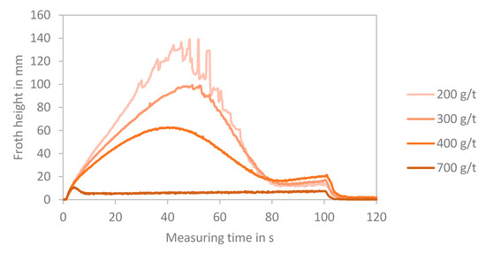 Several indicators have been introduced for the assessment of the froth stability, including froth half-life time, froth maximum height at equilibrium, bubble growth across the froth phase, air recovery and solid loading on bubbles on the top of the froth surface, froth velocity, and froth rising velocity [36]. The maximum height can be well correlated with the frothing ability and froth stability [37,38]. Bikerman [39] introduced the dynamic stability factor (∑) as the ratio of the maximum volume of generated foam or froth to the gas flowrate given by Equation (1). This factor has been used in froth flotation studies, e.g., by Mackay et al. [40], and McFadzean et al. [41,42].