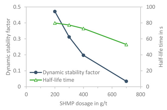 The dynamic stability factor ∑ calculated using Equation (1), where hmax is determined from Figure 5, A = 1256.6 mm2 and Q = 0.4 L/min. Figure 6 displays both the half-life time of the bubble (t1/2) and the dynamic stability factor ∑ decreasing with an increased SHMP dosage. The dynamic stability factor ∑ reduced from 0.47 to 0.03 with an increasing SHMP dosage from 200 g/t to 700 g/t, respectively. The decreasing in the dynamic stability factor and half-life time of the bubbles, with an increasing in the SHMP concentration, causes the reduction in the recovery (see Figure 11) and the entrainment of the fine gangue particles (Figure 14).