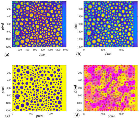 The image processing is treated similarly to the method proposed by Boos et al. [49], which was described by Hoang et al. [35]. Firstly, Gaussian filtering with a radius of 20 pixels is employed in order to smoothen distortions from the particles positioned inside the lamellas (Figure 7b). Subsequently, binarization (Figure 7c) and a skeleton transformation (Figure 7d) virtually removes the thick, wall-touching Plateau borders and reveals the contact lines of the lamellas at the wall separating the bubbles. Each area bound by a set of contact lines represents the contact area of one bubble with the wall. Segmentation (Figure 7d) yields the size of all the contact areas in the field of view. The objects close to the rim of the image or with an area smaller than 10 px2 are ignored. The blue circles in Figure 7d mark all the accepted bubble contact areas.