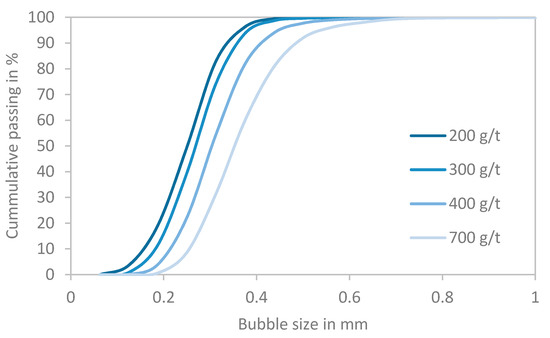 The pulp suspensions used for the dynamic froth analysis are prepared such as the ones used in the batch flotation and sedimentation tests. The fresh suspensions have been prepared for each test to prevent aging effects of the pulp properties. Each condition had been measured in triplicates. A 60 mL sample of this pulp is transferred to a transparent glass column of 40 mm inner diameter of the DFA-100 (Krüss, Germany). The froth is generated by bubbling air through a ceramic frit (pore diameter 16 µm–45 µm) at 0.4 L/min air flow rate for a constant duration of 100 s. The froth properties, including its height and structure, are recorded to evaluate dynamic parameters of the frothing ability, froth stability and time-dependent bubble size distributions. The bubble size distribution is observed at a fixed camera position (60 mm), froth height and employing an adapted image processing algorithm described in Section 3.3.2 below.