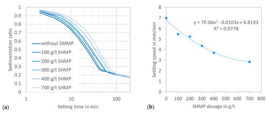 It is widely known that depressants mostly act as dispersants as well, which has a great capacity of dispersing fine particles; however, it also causes negative pulp effects in the downstream processes, such as in solid–liquid separation, i.e., thickening and filtration. As shown in Figure 9, the sedimentation ratio and settling speed decreases with an increase in the SHMP concentration. It was observed that the filtration of the tailings after flotation took longer with higher SHMP dosages. Hence, this effect needs to be considered in terms of flotation performance, downstream processes’ cost and more importantly, the negative impact on the wastewater when using a high amount of SHMP.