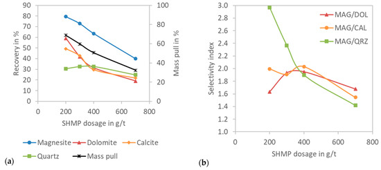 Effect of sodium hexametaphosphate consumption on the recovery (a) and (b) selectivity between magnesite and gangue minerals.