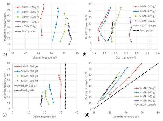 Figure 12a,b indicate that using only 350 g/t of HEDP can achieve a similar grade (76.3%) as 700 g/t of SHMP (76.9%), while it has little effect on the magnesite recovery. The magnesite recovery is about 57% compared to 40% when using 700 g/t of SHMP. Most importantly, the hydrophilic quartz mineral ending up in the concentrate is lower than in the case of using SHMP (Figure 12b). HEDP effectively depresses dolomite, resulting in a low dolomite grade of 18% as similar to the case of using 700 g/t of SHMP (Figure 12c), and it shows very good selectivity between magnesite and dolomite (Figure 12d).