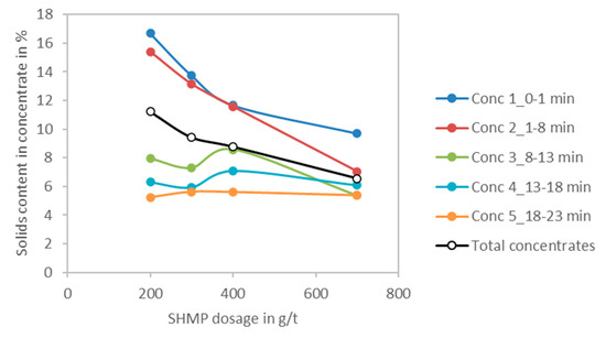 Solid content of concentrates as a function of SHMP concentration and flotation times.