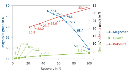 As shown in Figure 15, more cleaner stages lead to an increase in the magnesite grade and a decrease in the unwanted gangue minerals (i.e., dolomite and quartz). In contrast, this leads to a decrease in the recovery as well. There is a trade-off between the number of cleaner stages to achieve balance in terms of magnesite grade and recovery. The results were performed with the open circuits; however, these trends would be useful to design the flowsheet in order to obtain the final concentrate, which meets the requirement for calcination and sintering in terms of technical and economic considerations.