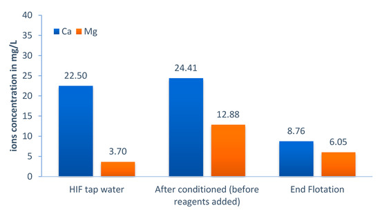 As can be seen in Figure 16, the Ca2+/Mg2+ concentration in the conditioning stage (before reagents added) is higher than their concentration in tap water (i.e., Ca2+ ca. 22.5 mg/L, Mg2+ ca. 3.7 mg/L). It was also observed that the pH increases during conditioning, which demonstrated that fine minerals were diluted in the solutions. Figure 16 shows that the ions concentration at the end of flotation reduced significantly, even though the tap water was added to maintain the pulp level. All the used reagents (soda Na2CO3, sodium silicate Na2SiO3, sodium hexametaphosphate Na6[(PO3)6], and Resanol A100 collector) can interact with Ca2+; Mg2+ ions, species CO32− or SiO32− to precipitate calcium/magnesium silicate, calcite CaCO3, etc., changing the mineral surfaces and consuming reagents, which is the reason for this significant decrease in the ion concentrations (Figure 16).