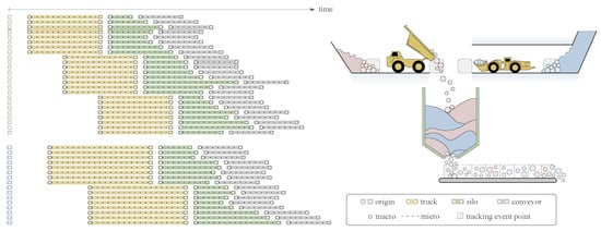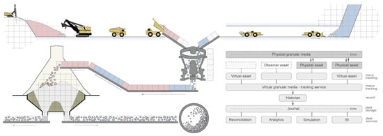 The fixed and mobile mining equipment constitute a discrete set of assets that transform the material by a set of unit operations, the primary two being move and fragment. Each pseudo-particle was tracked, or simulated, by a virtual asset, which is a real-time model that mirrors a physical asset and its unit operations on the material. We distinguished between high-frequency micro-tacking inside each asset and macro-tracking of special events, e.g., when particles enter or exit an asset or pass a point of special interest. This is illustrated in Figure 2.
