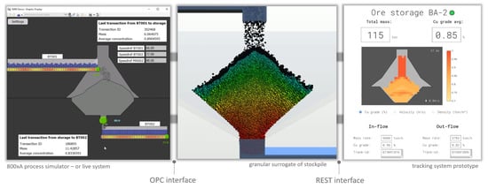 An integration test of using granular surrogates for micro- and macro-tracking was performed; see Figure 3. A virtual stockpile asset was created using AGX Dynamics for the particle simulation. To accelerate the simulations to real-time performance, a reduced-order model was trained from ground truth simulation data, as described in [], with a tracking accuracy of 10%. The storage asset was connected to an ABB 800xA process simulator [] using OPC [] for receiving a discharge control signal and for exchanging macro-tracking data. The ABB simulator represents the assets of the incoming and outgoing conveyors, discretized in bins moving with the controlled conveyor belt speed. Each bin on the incoming conveyor contains material with a specific mass, ore grade and a tracking id. That information is exchanged with the stockpile asset when a bin reaches the discharge point. The storage asset responds by emitting particles with the corresponding total mass and mineral concentration. The particles fall, impact and disperse over the pile surface as simulated by the physics-based stockpile model. The storage asset receives a discharge rate control signal from the ABB simulator. This drives a flow field in the bulk, and particles are propagated in real time by the data-driven reduced-order model. The particles that reach the outlet are eliminated, and a macro-tracking message is passed so that the ABB simulator receives information of the material that enters the outgoing conveyor. That information includes tracking ids, mass and ore grade. The micro-tracking data reside in the storage asset. A monitoring service was created as a stand-alone web application. It receives virtual sensor information from the stockpile asset using a REST (representational state transfer (REST): https://en.wikipedia.org/wiki/Representational_state_transfer; date accessed on 1 April 2021) interface. The monitoring information includes the total mass in the storage, the average grade and the spatial distributions of these quantities, as well as the predicted velocity field in the bulk of the pile. A video that demonstrates the integration test is included as Supplementary Material Video S1. It should be pointed out that the ABB 800xA simulator can be switched to sharing real-time data from a mine with the same layout.