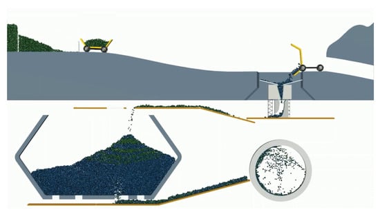A mine-to-mill process chain is illustrated in Figure 1. The performance of each individual process depends on its design and control and on the properties of the material feed. Each process also alters the state of the material. The complex interdependency among the process dynamics and variations in the material properties makes it hard to determine what is cause and what is effect. The mineral concentration, hardness, strength and toughness of the ore body is partially known in advance, from exploratory drilling, and stored in a block model []. These are input parameters to many models for blasting [], crushing [] or grinding [], such as the Kuz–Ram blasting and JKMRC grinding models. Measurement-while-drilling (MWD) of blast holes produces data that contain information about the geo-mechanical properties at higher spatial resolution than the exploration data. This may be used for improving the blast plans and for optimizing the subsequent processes [,,]. Drilling and blasting are conducted in cycles, each cycle producing a volume of fragmented rock that is loaded using bucket excavators or load-haul-dump trucks before the next blasting. The particle size and shape distribution are subsequently transformed by the crushers and grinders before entering the concentrator. Variations in the diggability of the blasted rock [,,] are useful for improving blast plans or for predicting the throughput at the crusher and mill. Transport and storage systems alter the location of the material, but may also induce (unwanted) mixing and segregation that propagate to subsequent processes and affect the dynamics there. Mine-to-mill analysis and optimization require knowledge of these changes, but on-line measurements of granular media properties are inherently difficult. The material movements during vehicle and belt conveyor transport are easily tracked, and these systems may be instrumented with sensors for monitoring some of the material properties. However, in chutes, stockpiles and silos, little is known about the material beyond the knowledge of what is fed into them. If any sensors can be installed at all, the observations are either indirect or limited to the surface of the granular media, which constitutes a small and perhaps not representative fraction of the bulk. Conventional tracking systems, which rely on combinations of plug-flow models (or first-in/first-out) and perfect mixing models that are calibrated using tracer experiments [], fall short on transport and storage systems with complex surface and discharge flow. This creates blind spots in the tracking of material movements and knowing the properties at any given location.