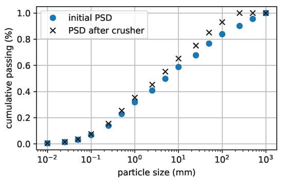 Each haul truck received a load of roughly 15 tons (roughly 150 pseudo-particles) at the loading point. For simplicity, the loading equipment was not modelled explicitly. The trucks dumped the load on the crusher inlet, and there, mixing of the material sources occurred from here on. The crusher was modelled as a jaw crusher, drawing material from above and crushing it with a jaw driven in an oscillatory motion. The pseudo-particles retained their original diameter, but when they passed the jaw, the internal particle size distribution was transformed. The fractions larger than the crusher gap width, m, broke into a uniform distribution of the smaller size classes. This unit operation was represented by , with the change vector for crushed (oversize) fractions, for (otherwise zero) and the change vector for the undersized fractions (otherwise zero). The resulting size distribution is shown in Figure 5. We assumed that the torque for driving the jaw crusher was in proportion to the amount of mass in the crusher zone , its hardness and size distribution, according to the following model: