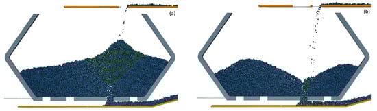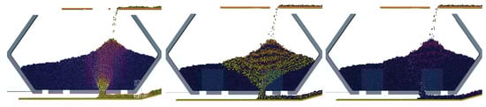 The stockpile held up to 2000 tons (roughly 20,000 pseudo-particles). There were two entry discharge points and four exit discharge points, but only one was used for the presented tests. When material was discharged from the bottom outlet, at a controlled speed ranging up to 2 m/s (or two tons/s), a funnel flow field was activated in the pile, reaching the surface where a depletion was gradually formed, unless new material was fed into the storage at the same rate or faster. Two time instances of pile states are shown in Figure 6. For the pointy pile state, one can expect more mixing of the incoming material and longer residence time, contrary to the depleted pile state where material flowed more directly through the storage and with less mixing.