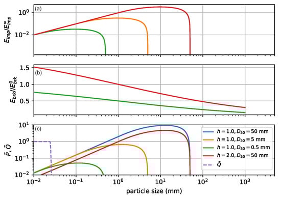 where is an impact energy distribution function, is a specific breakage energy distribution, is the (time-dependent) mean diameter of the material currently in the grinder, mm is a grinding length-scale parameter and a dimensionless breakage coefficient. The internal drive friction, , of an empty mill and the critical mill speed, rad/s, were used for normalization. The mill breakage model can be seen in Figure 7, with . The exit probability is also included.