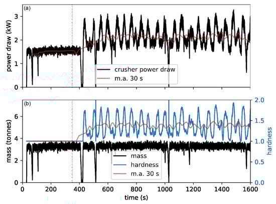 The response in the crusher power draw (a) from a step change in the mineral hardness (b). Included are also 30 s moving averages, and the momentaneous mass in the crusher volume is also shown.