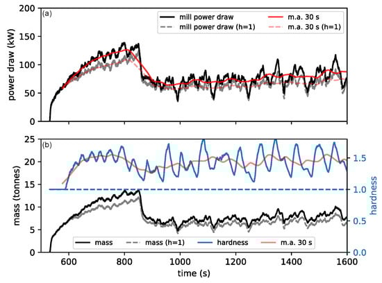 The response in the mill power draw (a) from a step change in the ore hardness (b) after passing through the storage in Figure 6. The ore mass in the mill is also included and a 30 s moving average of the power draw and hardness. For reference, the case of constant hardness () is also included.