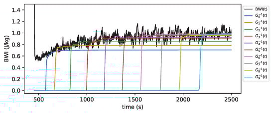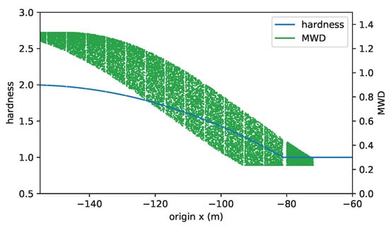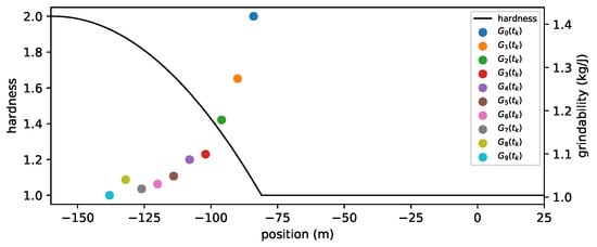 where the weight factor is given by the ratio of the mass with origin i to the mass in the mill and relative to the block mass . Here, is the amount of mass in the mill and is the total mass of the ore block i. Note that the weight factor is small (or zero) when there is little (or no) mass from the considered block. The weight factor for the original grindability reflects the confidence of that estimate, if the confidence is low and if the confidence is high. We tested backtracking the grindability of the ore originating from the left source for the case of a quadratic hardness profile shown in Figure 10, but mixed in the mill with ore from the right source. We used a block size of 10 m and . The BWI signals are shown in Figure 15, and the grindability backtracked to the source using Equation (9) is found in Figure 16.