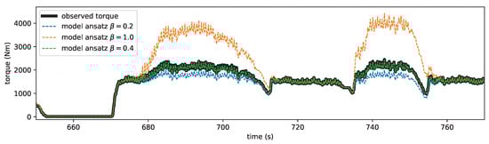 Comparison between the observed crusher torque and the expected torque for different model parameters of the ansatz for the MWD–hardness relation. When the deviation is small (), the model is calibrated. In the presented period, four truck loads reach the crusher, two from the left source with harder ore and two from the right source.