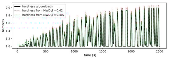 Assuming the crusher torque is related to rock hardness according to Equation (4), any ansatz can be explored and optimized with respect to model parameter . Different outcomes for the ansatz are shown in Figure 11. The best fit was found at , which deviated by % from the ground truth because of the tracking location error that was introduced. Note that empirical models between the ore tensile strength and adjusted drill penetration rate have this form in the literature []. Once a relation between the MWD signal and hardness was established, it was possible to predict the hardness of the material that was about to enter the crusher given the MWD signal measured at its location of origin. This is illustrated in Figure 12 over a sampling duration of 2500 s, or roughly 40 haul trucks from the left source.